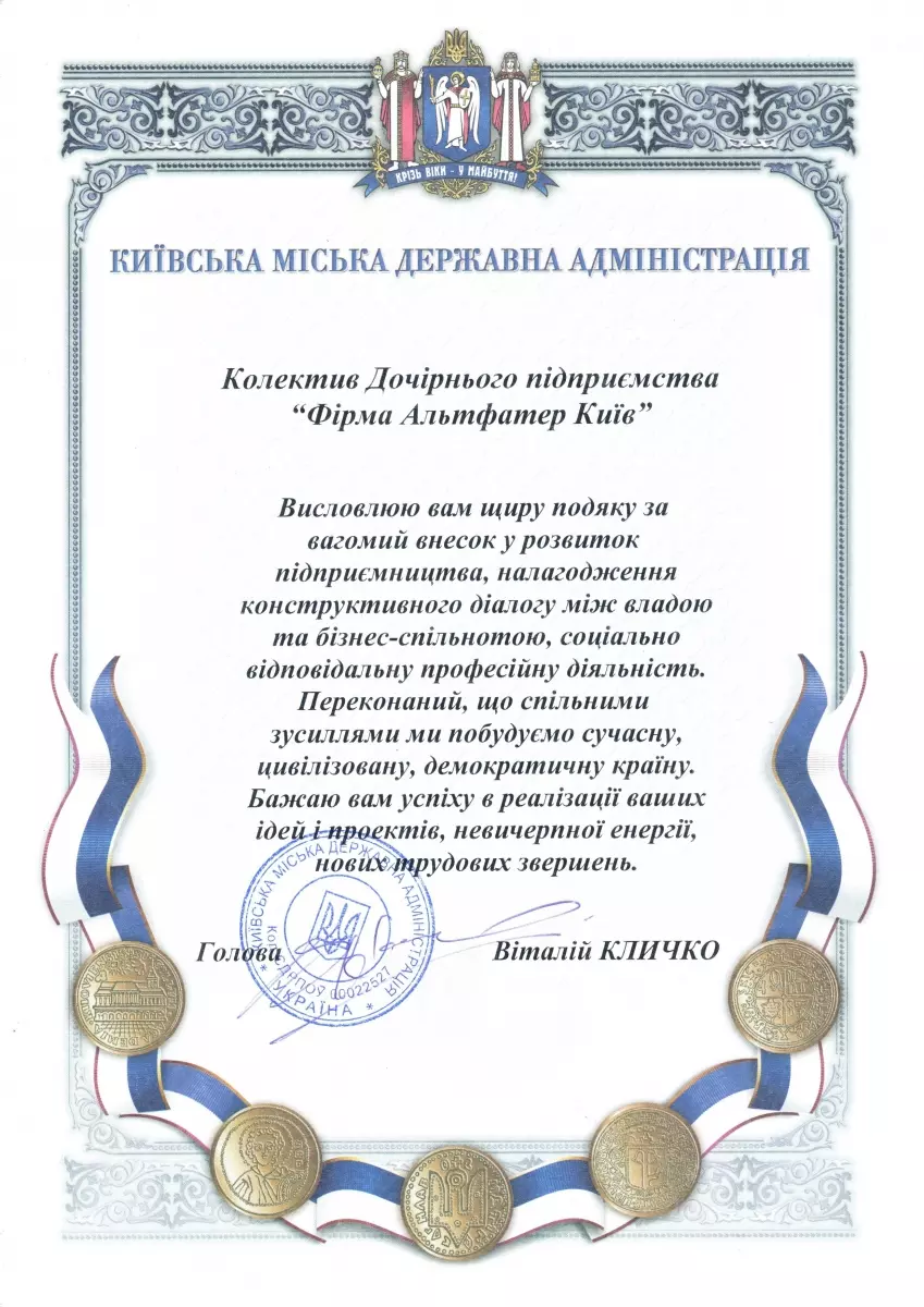 Відзнака «Найкраща компанія у галузі» надана Дочірньому підприємству «Альтфатер Київ» мером столиці Віталієм Кличко за «вагомий внесок у розвиток підприємництва, налагодження конструктивного діалогу між владою та бізнес-спільнотою та соціально відповідальну професійну діяльність». Ця престижна нагорода надається кожні три роки компаніям, що демонструють найвищий рівень ефективності у певній галузі.